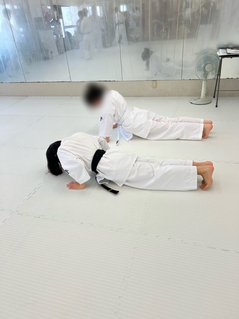 稽古後は自主練習です 稽古の様子 2026.01.25 2026.01.18 黒帯の先輩が丁寧に教えてくれます 中学生は体力作り 一般クラスの後は、自主練習です。昇級審査に向けて腕立て伏せや、組手の稽古を行いました。 中学生は今、学校の授業で持久走をしているそう。持久走と体力作りと相乗効果が期待できますね😊 壮年部は組手の練習を。無心で稽古に打ち込む瞬間はとても新鮮で気持ちがいいですよ👊🏼 はじめはできる回数からでいい。続けることが大事です。仲間がいれば頑張れます!